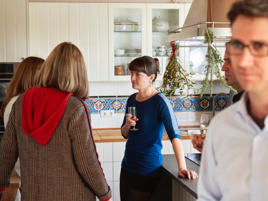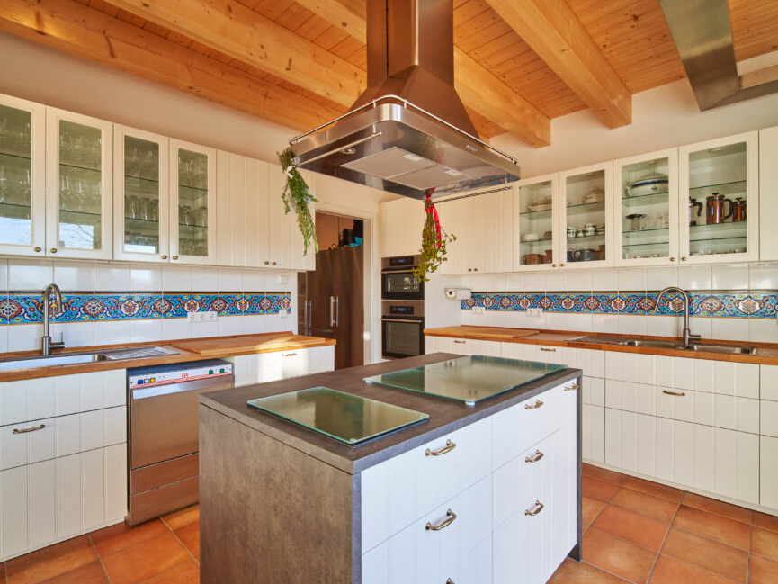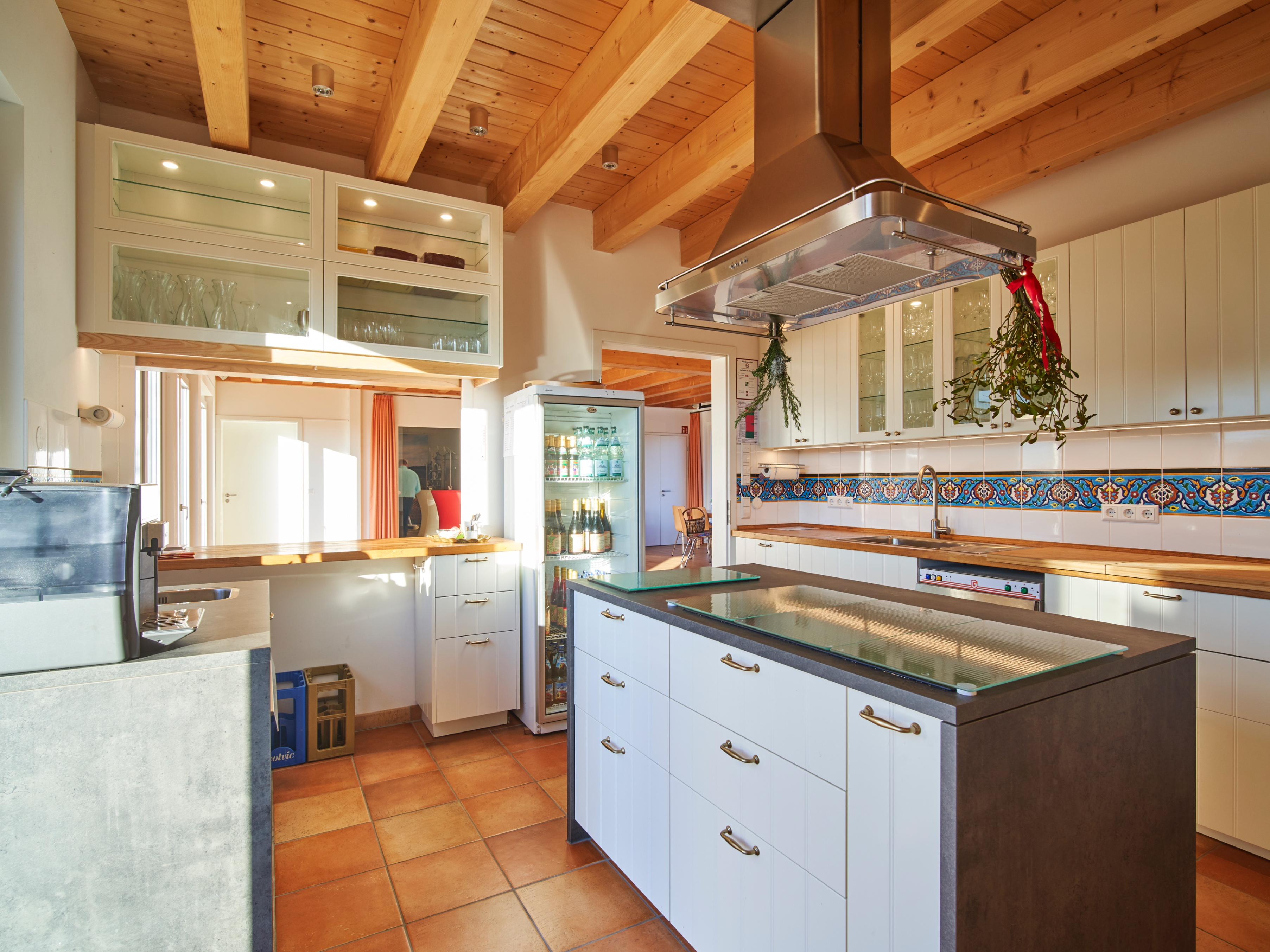 Unsere 18 m² große, stilvoll gestaltete Küche mit portugiesischen Kacheln schafft eine einladende Atmosphäre für Ihre Gäste während der Pausen. Hier wird das Buffet unseres hauseigenen Verpflegungsangebots angerichtet. Die Küche eignet sich außerdem hervorragend für Koch- und Grillkurse sowie Kochevents.