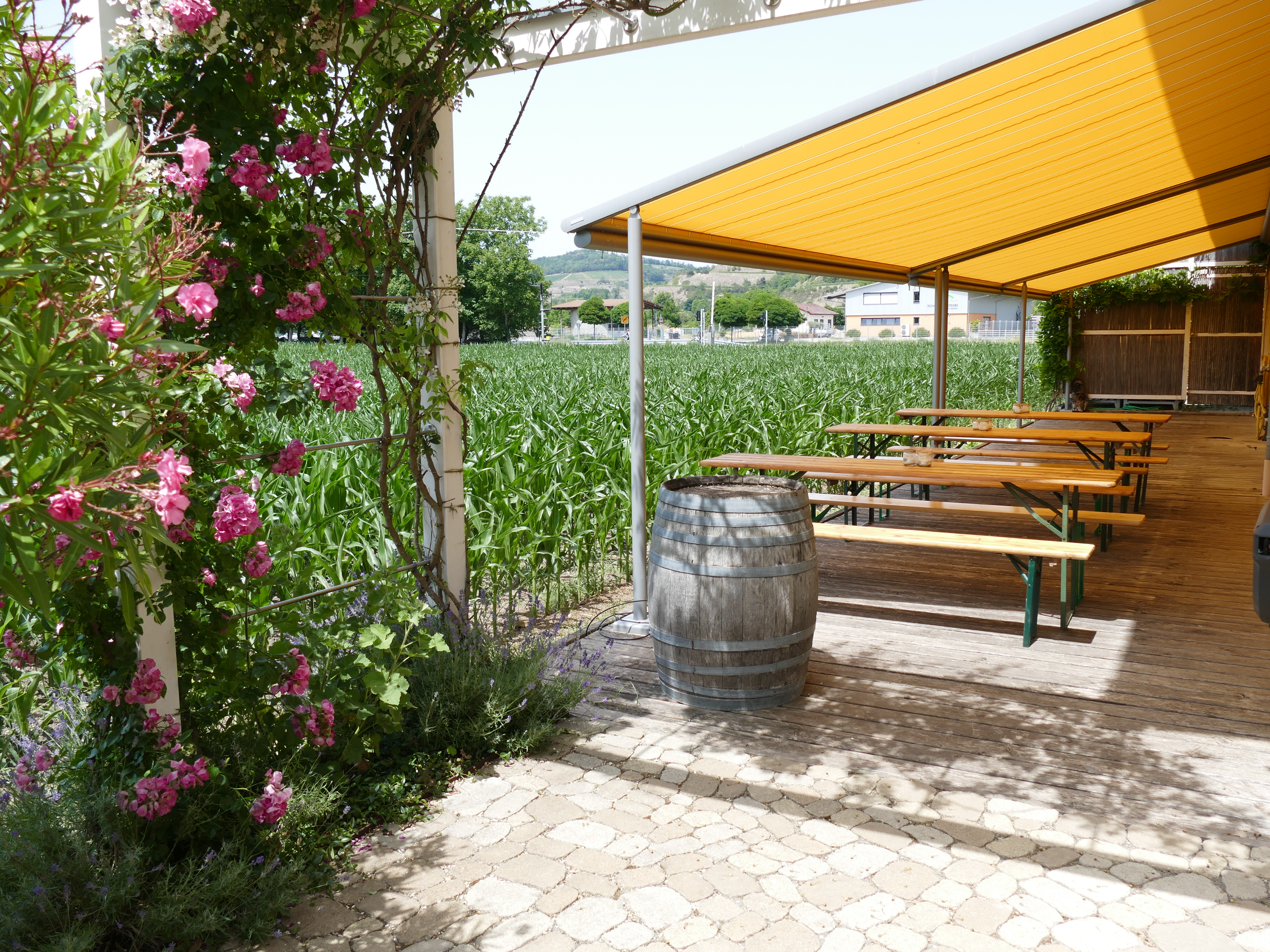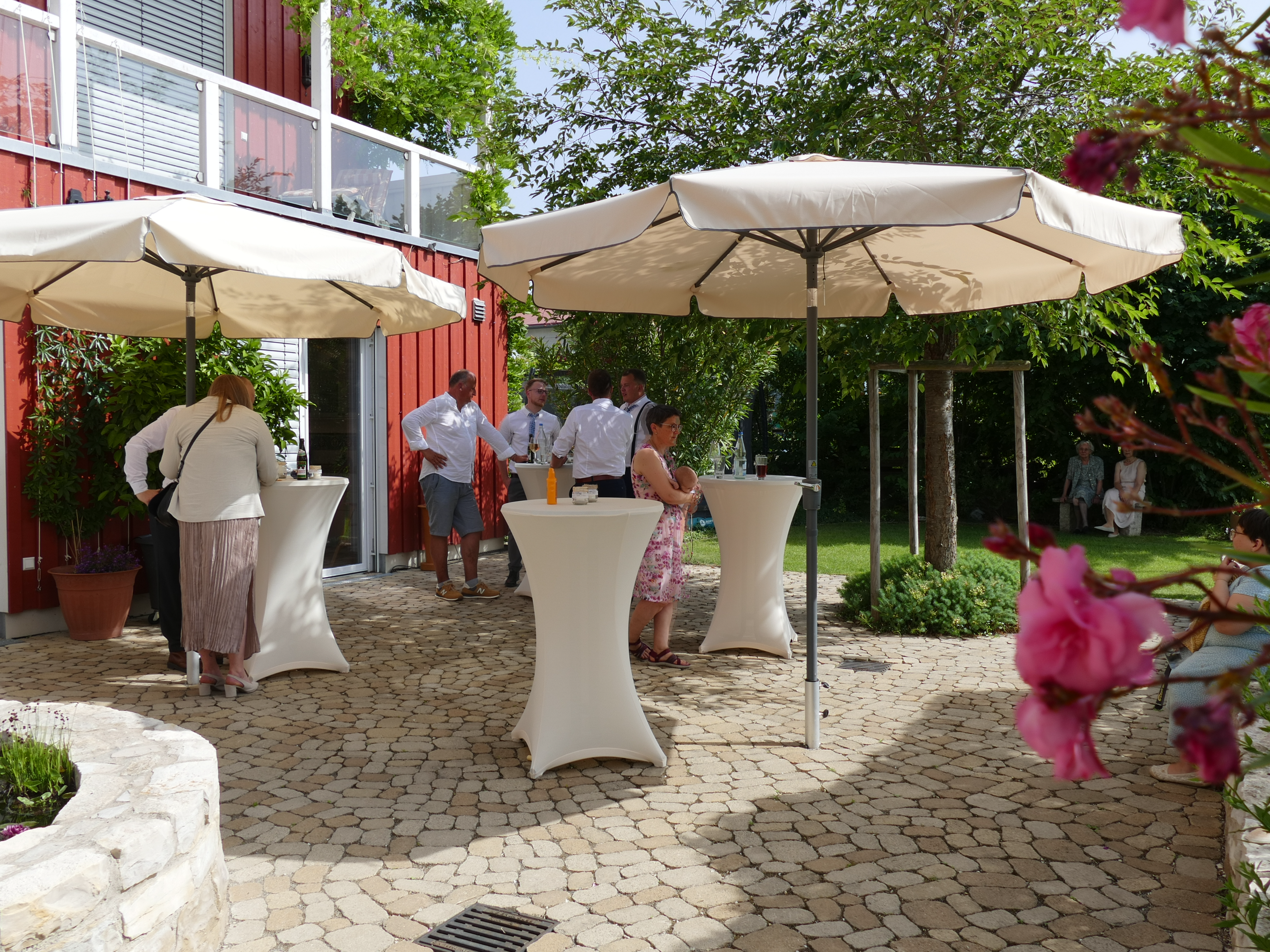 Sonnenterrasse mit Markise – perfekt für Kaffeepausen oder Gruppenarbeiten im Freien